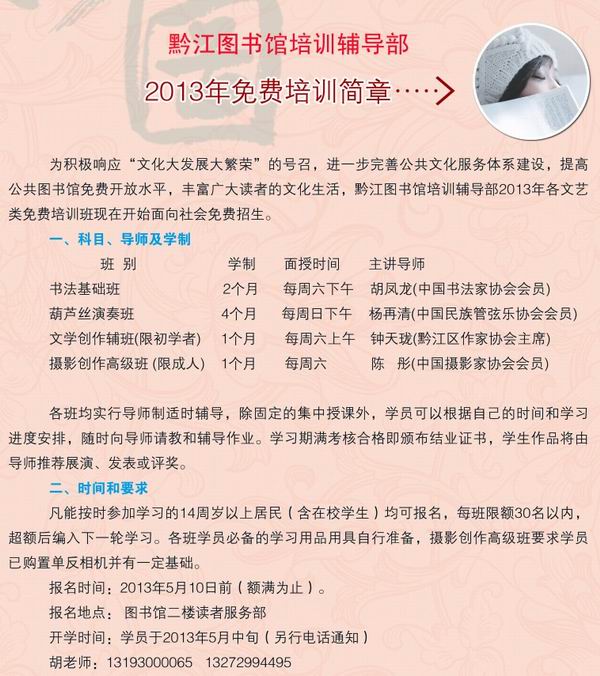 黔江圖書館培訓輔導部2013年免費培訓班簡章